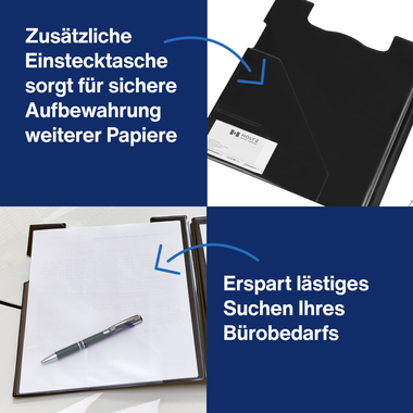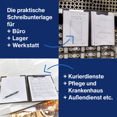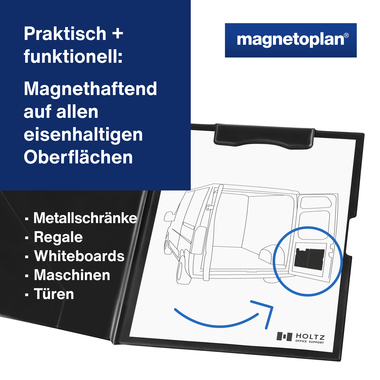Schreibmappe, perfekt nutzbar, wenn glatte Schreibflächen in Werkstatt, Lager und Büro gefordert sind. Aber auch für den mobilen Einsatz wie Vertrieb, Pflege-, Kranken- und Kurierdienste, Speditionen u.ä.. Haften außerdem an allen eisenhaltigen Wänden und Oberflächen wie Schreibtafeln, Metallschränken, etc. und kann dort als praktische Schreibauflage genutzt werden. Durch vollflächigen Kunststoff-Bezug auch für Kühlhäuser geeignet. Mit integrierten Neodym-Magnete.